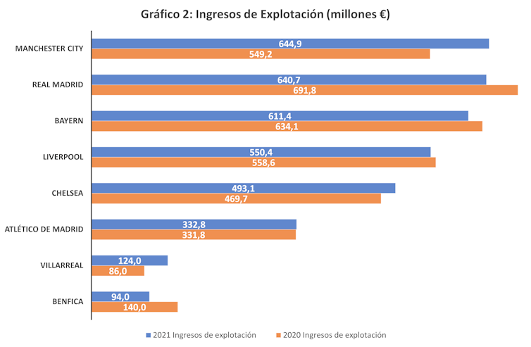 En el gráfico 2 se muestran los ingresos de los clubes en los ejercicios 2020 y 2021, donde se puede ver la diferencia existente entre los tres clubes más grandes, Manchester City, Real Madrid y Bayern, que en 2021 superaron los 600 millones de euros en ingresos.