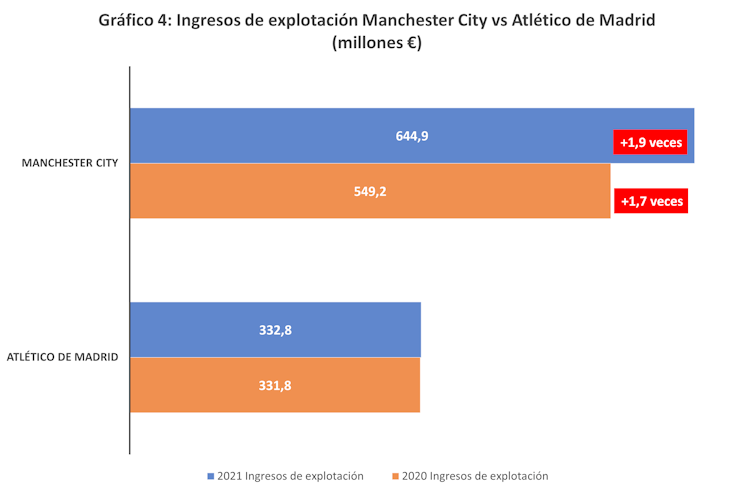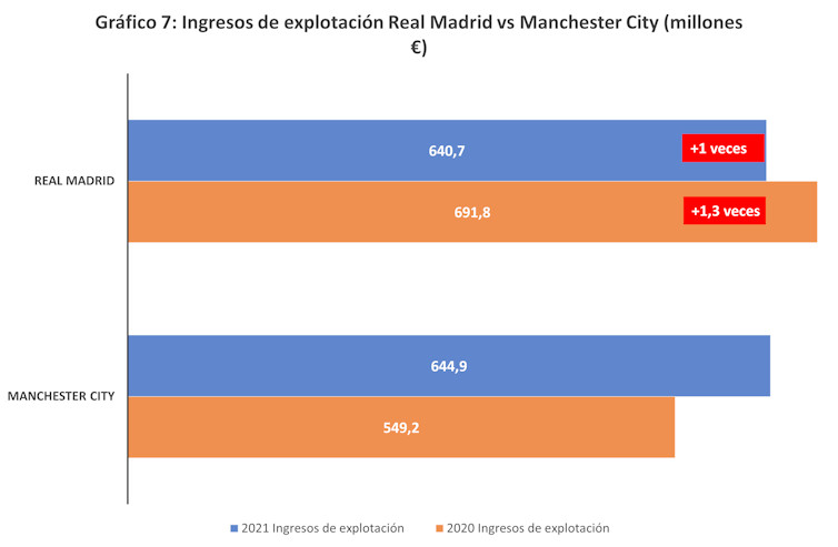 En el primer caso (gráfico 7) existe una gran igualdad económica, puesto que los ingresos de ambos clubes en 2021 fueron similares, aunque la diferencia favorecía al club madrileño en 2020.