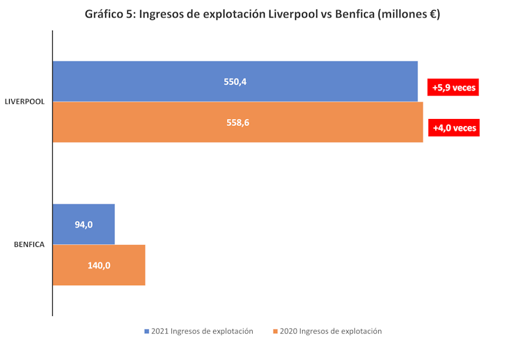 Esta eliminatoria de cuartos de final fue la que registró más goles y donde mayor diferencia se produjo entre los del equipo ganador y el perdedor. Como se muestra en el gráfico 5, la diferencia entre el Liverpool y el Benfica a nivel de ingresos fue de casi 6 veces en 2021, y de más de 450 millones de euros en cifra absoluta. El ganador de la eliminatoria fue, al igual que las dos anteriores, el club más grande (en este caso, mucho más grande).