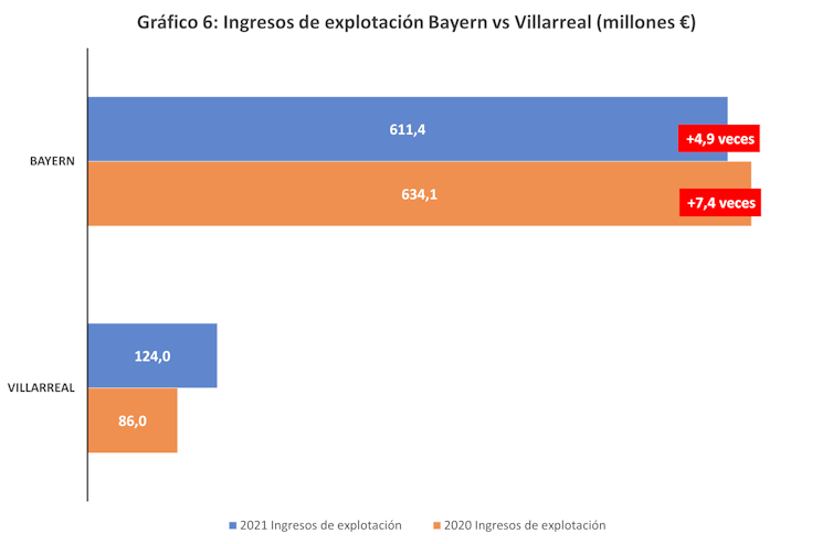 Finalmente, en el último cruce de cuartos de final analizado, nos encontramos ante la gran sorpresa del pase a semifinales. El Villarreal se impuso por 2-1 al Bayern alemán, club que tiene unos ingresos que superan en casi 5 veces (en 2021) al equipo español. En este caso, el club más pequeño (mucho más pequeño) superó al más grande (mucho más grande).