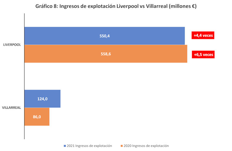 La segunda semifinal entre el Liverpool y el Villarreal (gráfico 8) presenta de nuevo una gran diferencia económica entre ambos clubes, puesto que el club inglés tiene unos ingresos en 2021 4,4 veces superiores a los del equipo español.