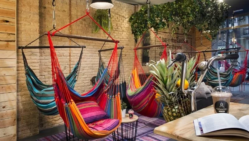 Tomar un café, un brunch o comer, ahora se puede hacer de una manera distinta, más relajada con la propuesta de Hammock Juice Station con su concepto que surgió en 2015 donde cambian las sillas por hamacas colgantes.