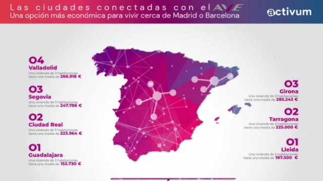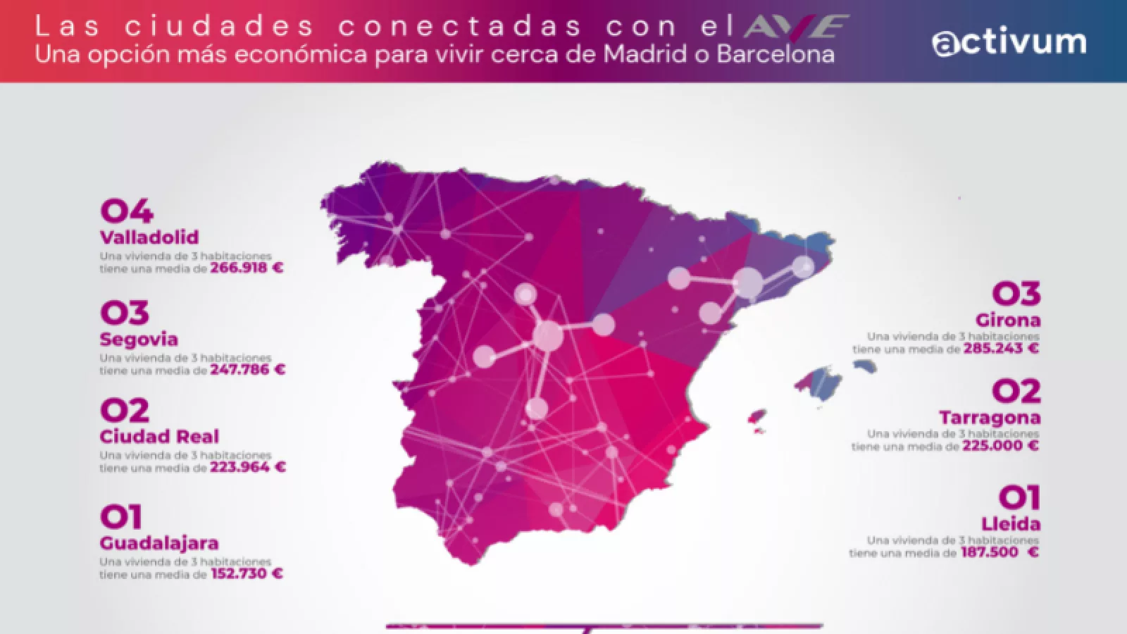 La ciudad con mayor porcentaje de obra nueva cercana a Madrid en AVE es Valladolid (con 1.556 viviendas de obra nueva), Segovia (292), Ciudad Real (245) y Guadalajara (135). Cercanas a Barcelona en AVE, las ciudades que se han visto impulsadas han sido Tarragona (490 viviendas de obra nueva), Gerona (386) y Lleida (126).
