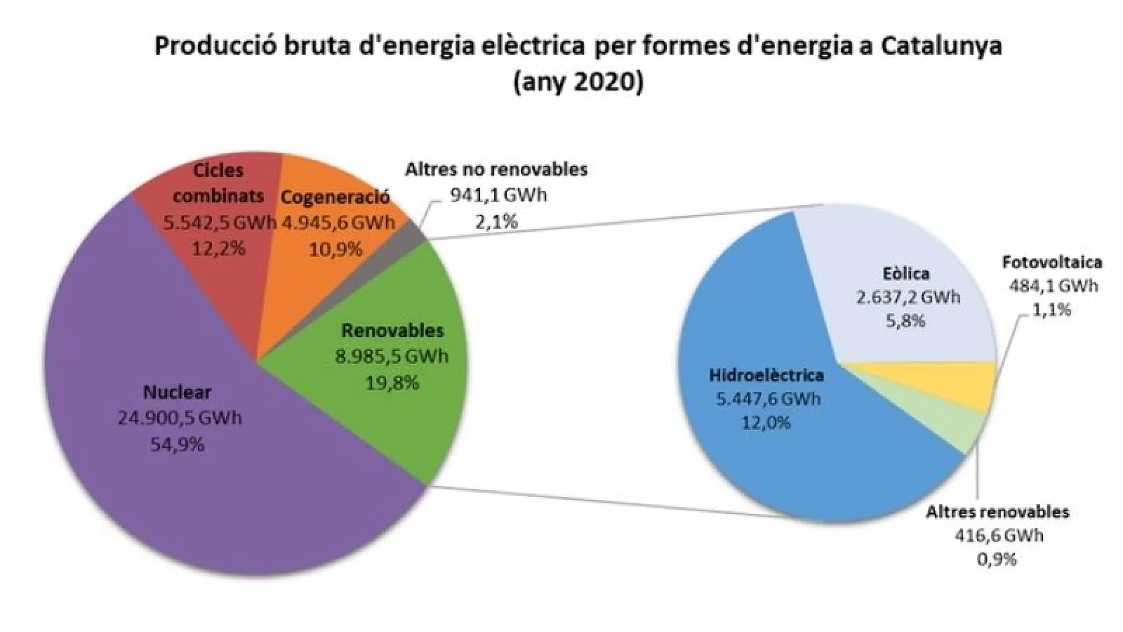 En cuanto al balance eléctrico del año 2020, la producción bruta de energía eléctrica en Cataluña en 2020 fue de 45.315,2 GWh. La energía nuclear fue la principal fuente para la producción de electricidad y generó el 54,9% del total, seguida de los ciclos combinados (12,2%) y las centrales hidroeléctricas (12%).