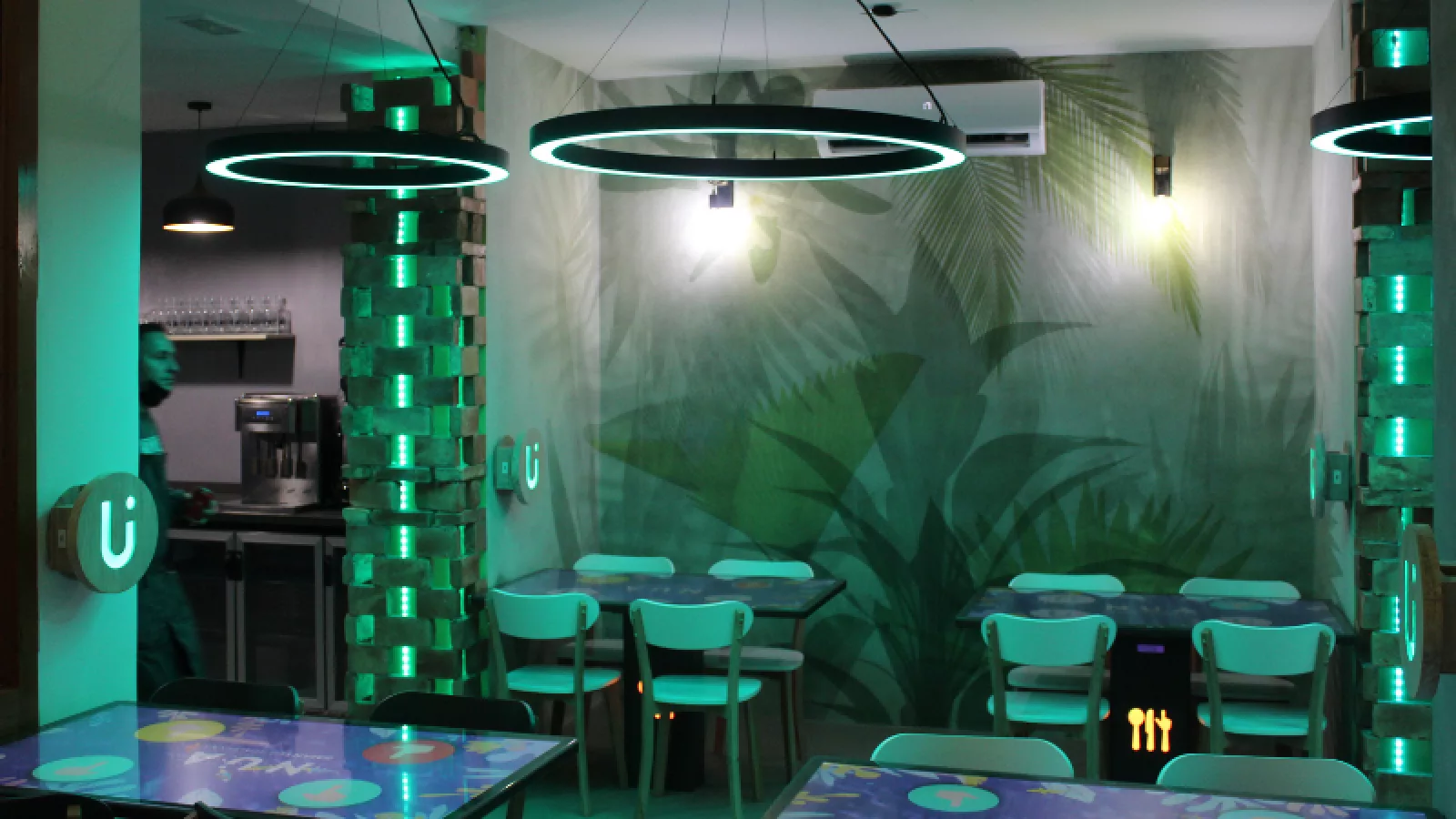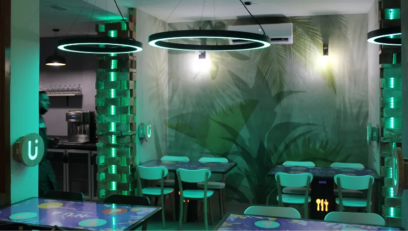 La iluminación, el sonido, las pantallas... En NÜA todo está conectado gracias a un sistema domótico y de inteligencia artificial. Según el momento del día y las necesidades de la clientela, estos elementos se transforman de forma natural generando diferentes ambientaciones.