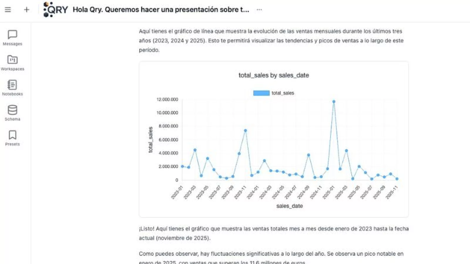 QRY ofrece funcionalidades avanzadas como memoria colectiva y grupos de trabajo, fomentando la colaboración y generando valor para los equipos de negocio, no solo de forma individual. La plataforma se conecta con otras herramientas empresariales como Salesforce para optimizar la gestión de leads. También con otros CRMs y ERPs para unificar la información de todas las fuentes, tanto de sistemas como de documentos, y generar insights de valor también con visualizaciones dinámicas a través de gráficos interactivos.