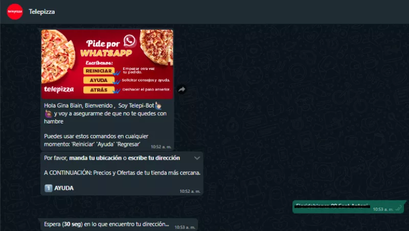 los clientes deberán abrir una conversación en esta red social y seguir los pasos que le indicará Telepi–Bot, el asistente virtual que, a través de determinados comandos, guiará a los clientes de Telepizza en todo el proceso del pedido.