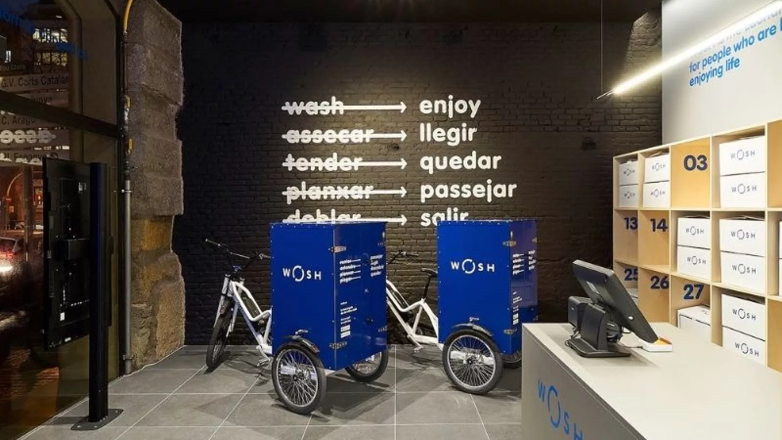 Hacer tu colada en Wosh es hasta cinco veces más ecológico que hacerlo en casa. Su tecnología de lavado es 100% ecológica, no usan percloroetileno y ahorran entre un 50% y un 75% de agua, si se compara con un lavado doméstico. Por otro lado, sus franquicias de lavandería, lo que llaman WoshStores, son fábricas de lavado urbanas, únicas en todo el mundo en términos de productividad, ecología, tecnología y diseño. Y no se olvidan del reparto a domicilio, lo hacen con bicicletas eléctricas o furgoneta de gas natural. Una atención total al planeta Tierra, únicamente usan detergentes de máxima calidad que son 100% biodegradables y, para la recogida de las coladas y la entrega de la ropa limpia de sus clientes, petates de lona personalizados y cajas de cartón.