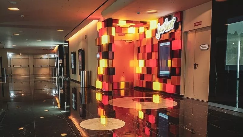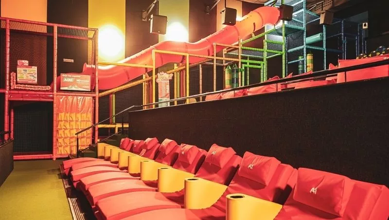 Las salas junior de Cine Yelmo cuentan con un diseño colorido, así como un enorme tobogán y piscina de bolas. Además, en este espacio, las tradicionales butacas de cine han sido sustituidas por tumbonas, cojines y/o pufs individuales o dobles que permiten una manera divertida de cine en familia.