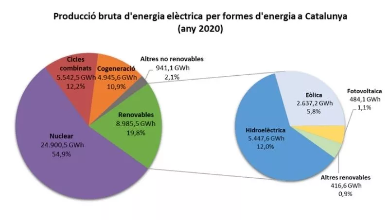En cuanto al balance eléctrico del año 2020, la producción bruta de energía eléctrica en Cataluña en 2020 fue de 45.315,2 GWh. La energía nuclear fue la principal fuente para la producción de electricidad y generó el 54,9% del total, seguida de los ciclos combinados (12,2%) y las centrales hidroeléctricas (12%).