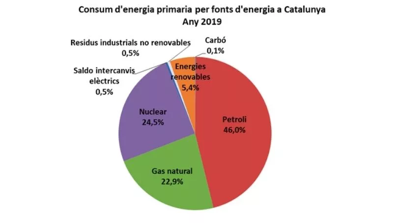 Más de un 30% de esta energía primaria se destinó a usos no energéticos –producción de productos químicos, etc.- y a consumos propios del sector energético. Del total de la energía primaria consumida en Cataluña, un 46% ha sido petróleo, un 24,5% nuclear y un 22,9% gas natural. Por su parte, las energías renovables han supuesto un 5,4% de la energía primaria consumida en Cataluña.