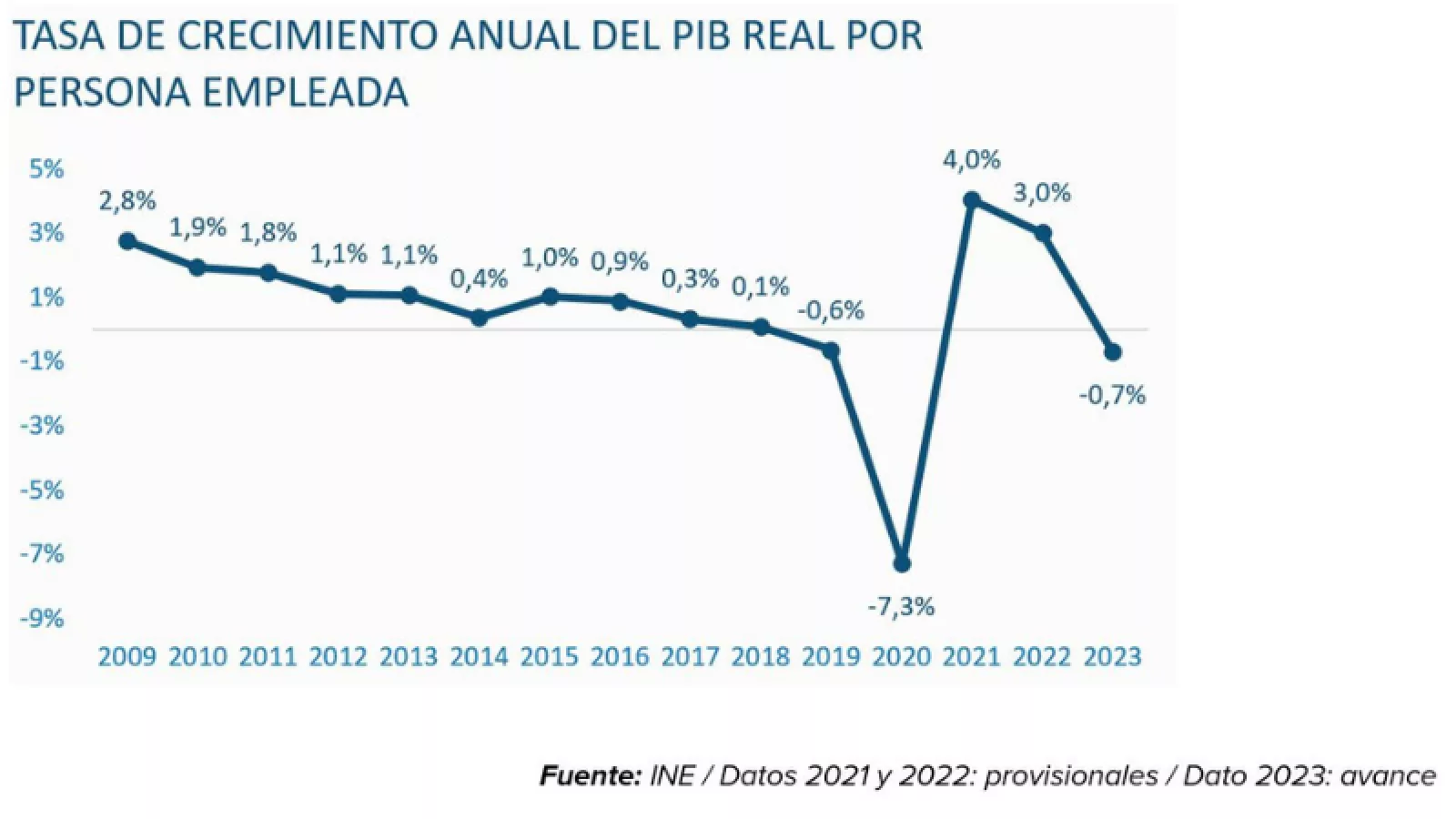 Según el Instituto Nacional de Estadística (INE), el crecimiento anual del PIB real por persona empleada muestra una tendencia a la moderación. En 2023, este indicador registró un descenso del 0,7%, situándose en niveles similares a los de 2019 (-0,6%), antes de la pandemia. Desde 2009, cuando este crecimiento alcanzó el 2,8%, se ha observado una caída progresiva, destacando la necesidad de estrategias para revitalizar el dinamismo productivo.