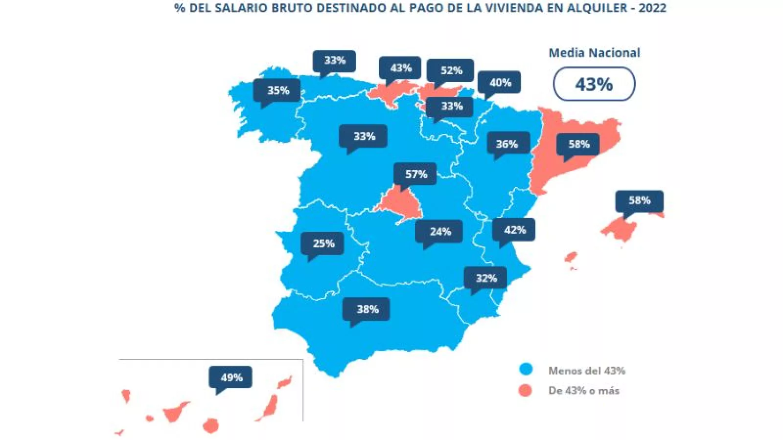 Si analizamos al detalle Baleares, vemos que el precio de la vivienda en alquiler cerró 2022 con un incremento anual del 18,2% y situó el precio de diciembre en 14,16 euros/m2 al mes. Esto supone que, teniendo en cuenta el salario bruto medio en Baleares registrado por InfoJobs, que en 2022 era de 23.292 euros (1.941 euros brutos mensuales si lo dividimos en 12 pagas); los baleares tuvieron que destinar el 58% de su sueldo bruto al pago del alquiler.