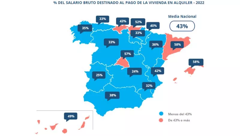 En el último año, en 10 comunidades autónomas se ha incrementado el dinero destinado a pagar el alquiler, mientras que, en siete de ellas, el porcentaje ha disminuido. En Baleares, una de las comunidades que destina el mayor porcentaje de sueldo bruto al pago del alquiler, se ha pasado del 49% en 2021 al 58% en 2022, según el estudio de InfoJobs y Fotocasa.