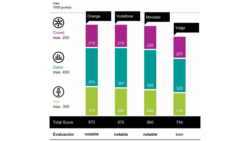 Tras estas dos empresas se sitúa Movistar, con 860 puntos, y, a más distancia, Yoigo, cuya red obtiene 754 puntos en el análisis, que ha realizado la consultora.