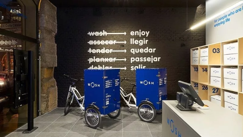 Hacer tu colada en Wosh es hasta cinco veces más ecológico que hacerlo en casa. Su tecnología de lavado es 100% ecológica, no usan percloroetileno y ahorran entre un 50% y un 75% de agua, si se compara con un lavado doméstico. Por otro lado, sus franquicias de lavandería, lo que llaman WoshStores, son fábricas de lavado urbanas, únicas en todo el mundo en términos de productividad, ecología, tecnología y diseño. Y no se olvidan del reparto a domicilio, lo hacen con bicicletas eléctricas o furgoneta de gas natural. Una atención total al planeta Tierra, únicamente usan detergentes de máxima calidad que son 100% biodegradables y, para la recogida de las coladas y la entrega de la ropa limpia de sus clientes, petates de lona personalizados y cajas de cartón.