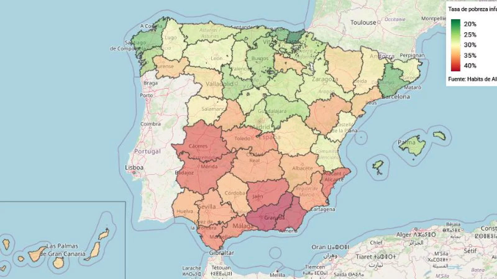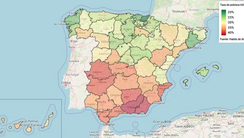 En clave provincial, Granada, con un 42,8%, es la que presenta un mayor porcentaje de población infantil en riesgo de pobreza.