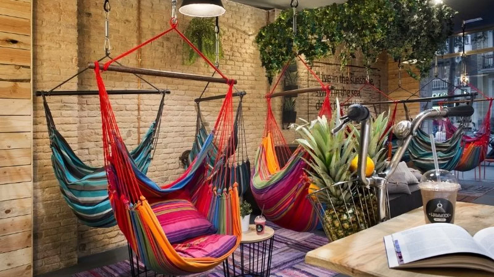 Tomar un café, un brunch o comer, ahora se puede hacer de una manera distinta, más relajada con la propuesta de Hammock Juice Station con su concepto que surgió en 2015 donde cambian las sillas por hamacas colgantes.