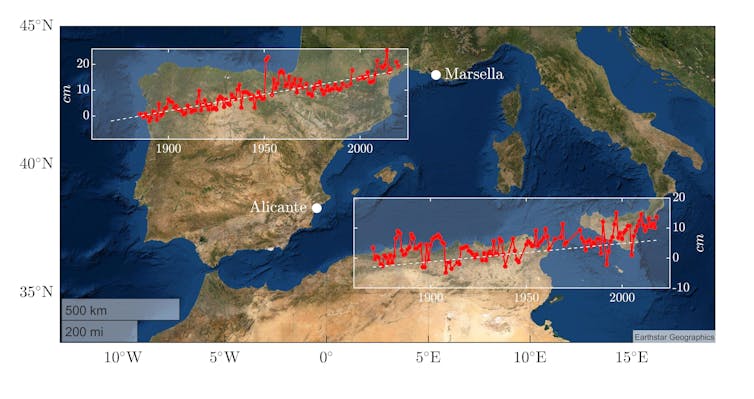 Algunas de las series temporales de datos más largas se encuentran en el Mar Mediterráneo, como la de Marsella y la de Alicante, cuyas mediciones comienzan en el siglo XIX (ver Figura).