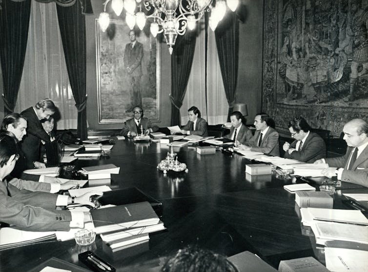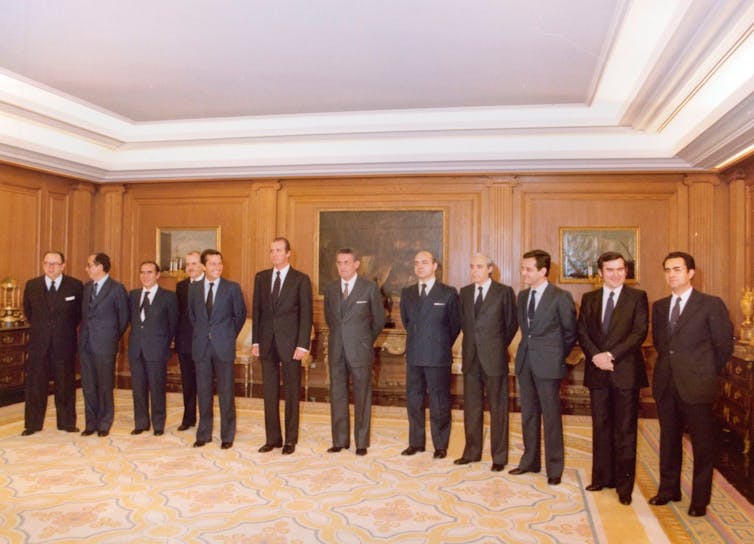 Por ejemplo, durante los primeros años de la democracia reinstaurada, Adolfo Suárez se apoyó no solo en el monarca y en Fernández-Miranda, sino muy principalmente en sus ministros más relevantes, a partir de 1977. Gracias, en buena medida, a Enrique Fuentes Quintana se pudieron establecer los referidos Pactos de la Moncloa en la legislatura constituyente.