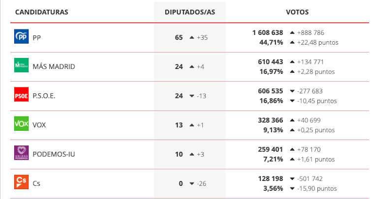 Los primeros sondeos dejaban a Podemos fuera de la Asamblea, por lo que la jugada personalísima de Pablo Iglesias resultó mejor de lo esperado. Sin embargo, una de las sorpresas de la noche electoral fue el anuncio del propio Iglesias, que hace tan solo unas semanas era vicepresidente del Gobierno de España, de que abandona la política activa al considerar que su figura ya no suma: «No quiero ser un tapón para los futuros liderazgos». A la manera del trumpismo, el discurso de Iglesias responde mejor a las bases de un movimiento social que a una estructura orgánica.
