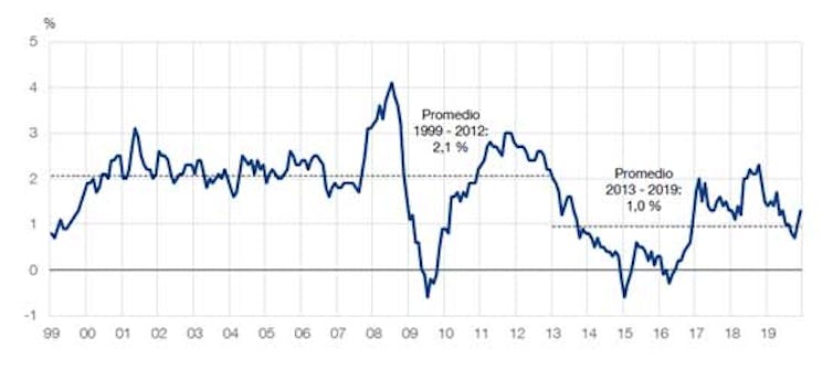 De hecho, la actuación del BCE desde la crisis financiera de 2008 ha sido expansiva, y más aún desde 2019. La tasa de inflación se mantuvo oscilando alrededor del 2 % hasta 2008. Las medidas económicas tomadas ese año provocaron cierta alza pero luego la inflación cayó. Posteriormente, a pesar de los estímulos de política económica, la inflación se ha mantenido muy por debajo del objetivo del 2 %.