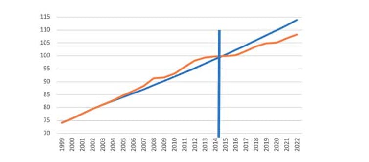 Aquí es, básicamente, donde está la clave de la reforma de julio de 2021. En 1998 se definió la estabilidad de precios como el aumento interanual inferior al 2 % del IPC armonizado y en 2003 se especificó que el objetivo era mantener una tasa de inflación inferior, pero cerca del 2 %.