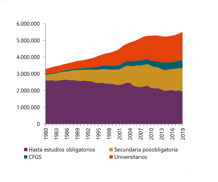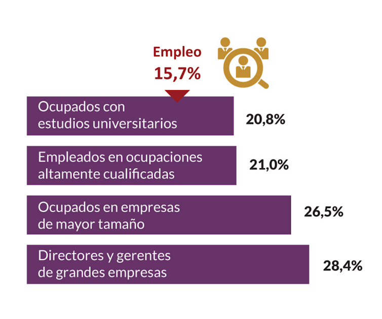 Además, presenta los mejores datos en términos de ocupación, tras haber duplicado el número de personas empleadas en las últimas cuatro décadas. Destaca la elevada proporción de empleados con estudios universitarios: el 41%, más de 10 puntos por encima de la media nacional. Esto se debe, fundamentalmente, a que Madrid dispone de la mejor oferta educativa y de la mayor demanda de formación de España, pues concentra el 21% de las ocupaciones cualificadas de todo el Estado.