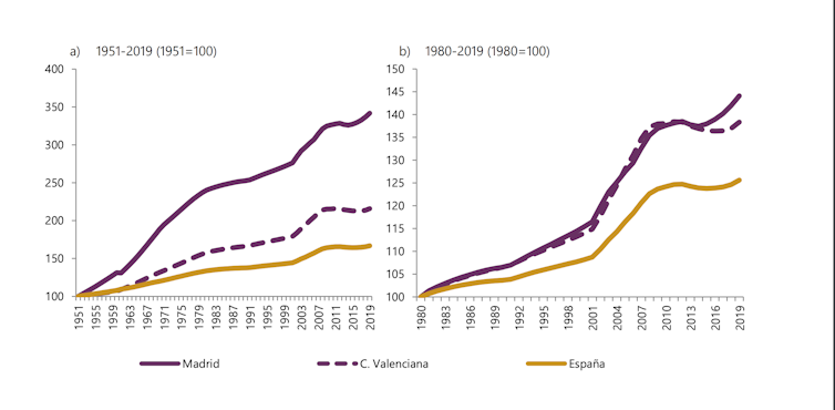 En los últimos 50 años la Comunidad de Madrid ha triplicado su población. Con solo el 1,6% del territorio español, su renta por habitante es un 36% superior a la media estatal y acumula una quinta parte de la renta nacional.