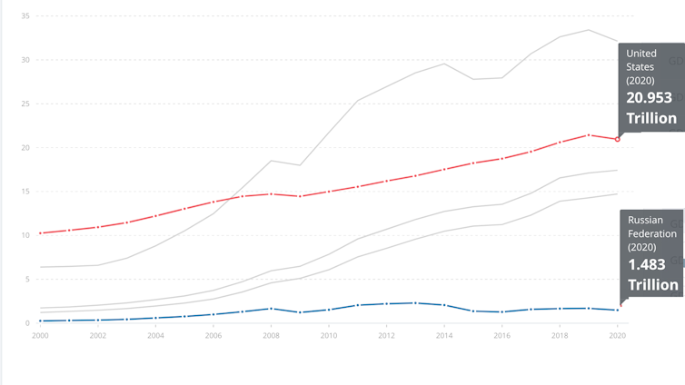 Las cifras son contundentes. El tamaño de la economía de Rusia es de cerca de 1, 5 billones de dólares, lo que representa tan solo el 7 % del PIB de los Estados Unidos. Por otra parte, la tiene un PIB conjunto de poco más de 15 billones de dólares entre sus 27 miembros, y el del es de 2,7 billones de dólares.