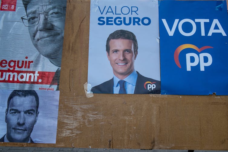 El rostro de Pablo Casado en un cartel electoral de las elecciones generales de 2019, que ganó el socialista Pedro Sánchez, abajo a la izquierda. Shutterstock / Olaf Speier