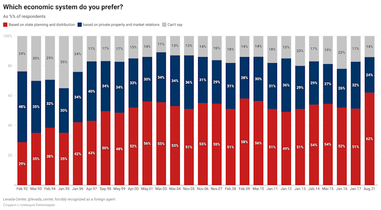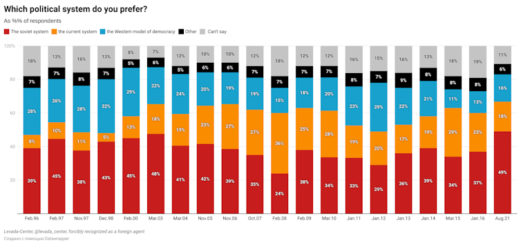 También el Levada Center indagaba recientemente sobre aspectos menos coyunturales como la economía o el papel del Estado. En octubre 2021, ante la pregunta “¿qué sistema político es el mejor?”, un 49 % contestaba que el sistema soviético, un 18 % que el sistema actual y un 16 % que la democracia occidental. Ante “¿qué sistema económico es el mejor?”, un 62 % de las respuestas aludían a la planificación y la distribución estatal y un 24 % a la propiedad privada y el mercado. En buena medida la nostalgia por la Unión Soviética de estas respuestas explican mucho del apoyo a Putin y a la invasión.