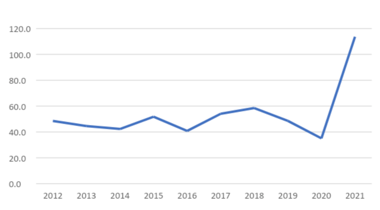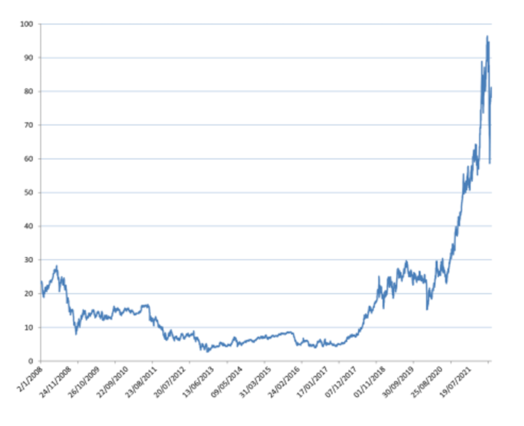 Los precios medios del pool durante 2012-2019 se situaron en torno a los 50 euros/Mwh; en 2020 se dio una disminución hasta los 35 euros/Mwh debido a la caída de la demanda en el contexto de la covid-19. En 2021 los precios no solo se recuperaron sino que, ya en la segunda mitad del año, se situaron casi siempre por encima de los 100 euros/Mwh, más del doble de lo que era habitual antes de la pandemia.