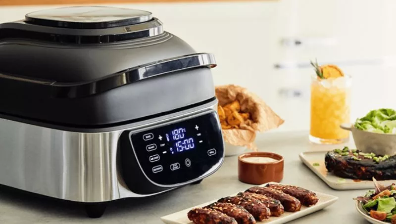 El Grill Multifunción de MasterPro está acondicionado con una potencia de 1.800 W que permite la elaboración de cinco tipos de cocción en el mismo producto. Cuenta con una olla y una placa de parrilla con revestimiento antiadherente para garantizar unos platos sabrosos cocinados a temperaturas que alcanzan los 250 grados. De esta forma, se puede utilizar como horno, parrilla que no extrae humo, asador, deshidratadora y freidora de aire caliente.