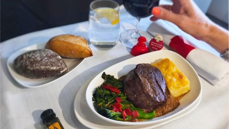 En los vuelos de corto y medio radio, los clientes de Business de Iberia pueden degustar también nuevos platos destacados, como un tartar de tomate y pimiento del piquillo marinado con pepino, servido con crema de aguacate y jalapeño; y, por otro lado, langostinos salteados con un toque suave de ajo, acompañados de arroz negro y calabacines asados.