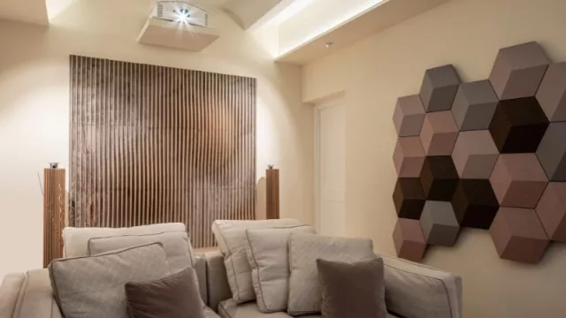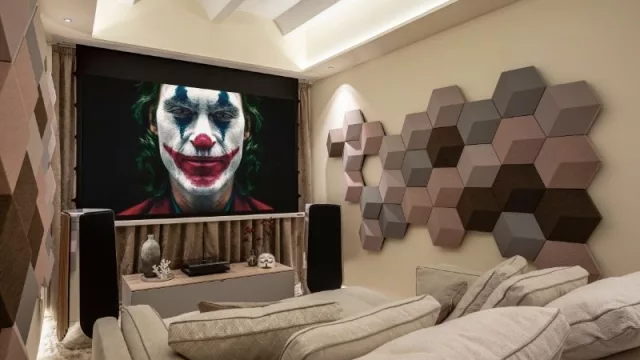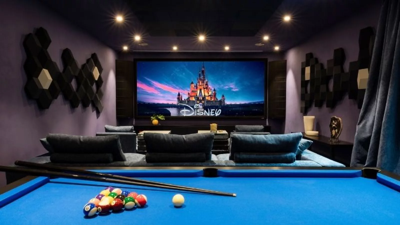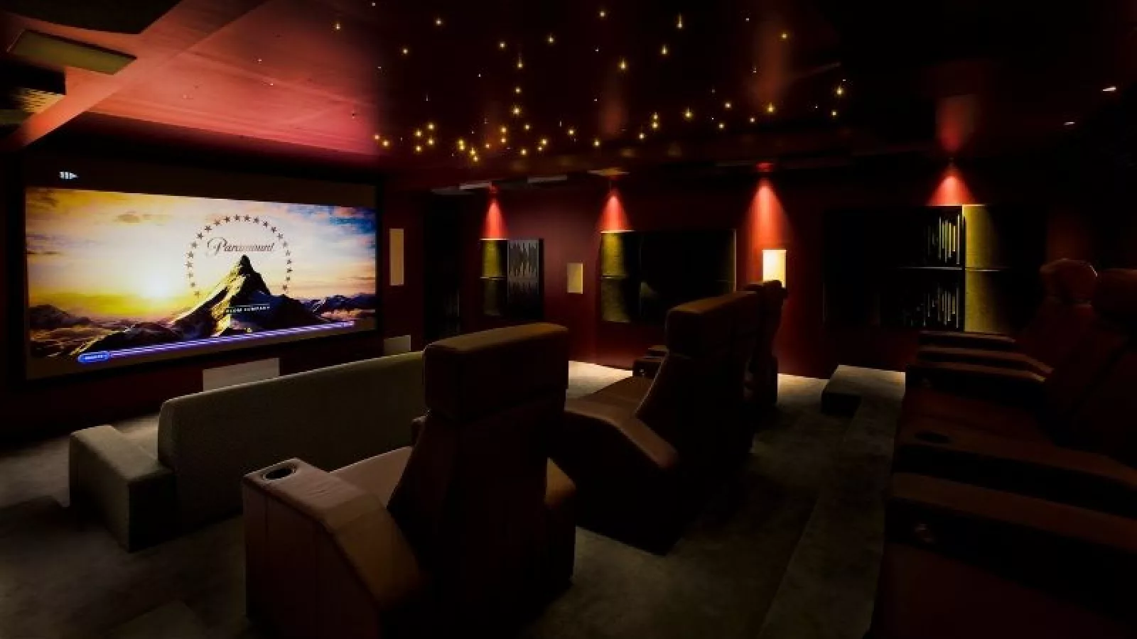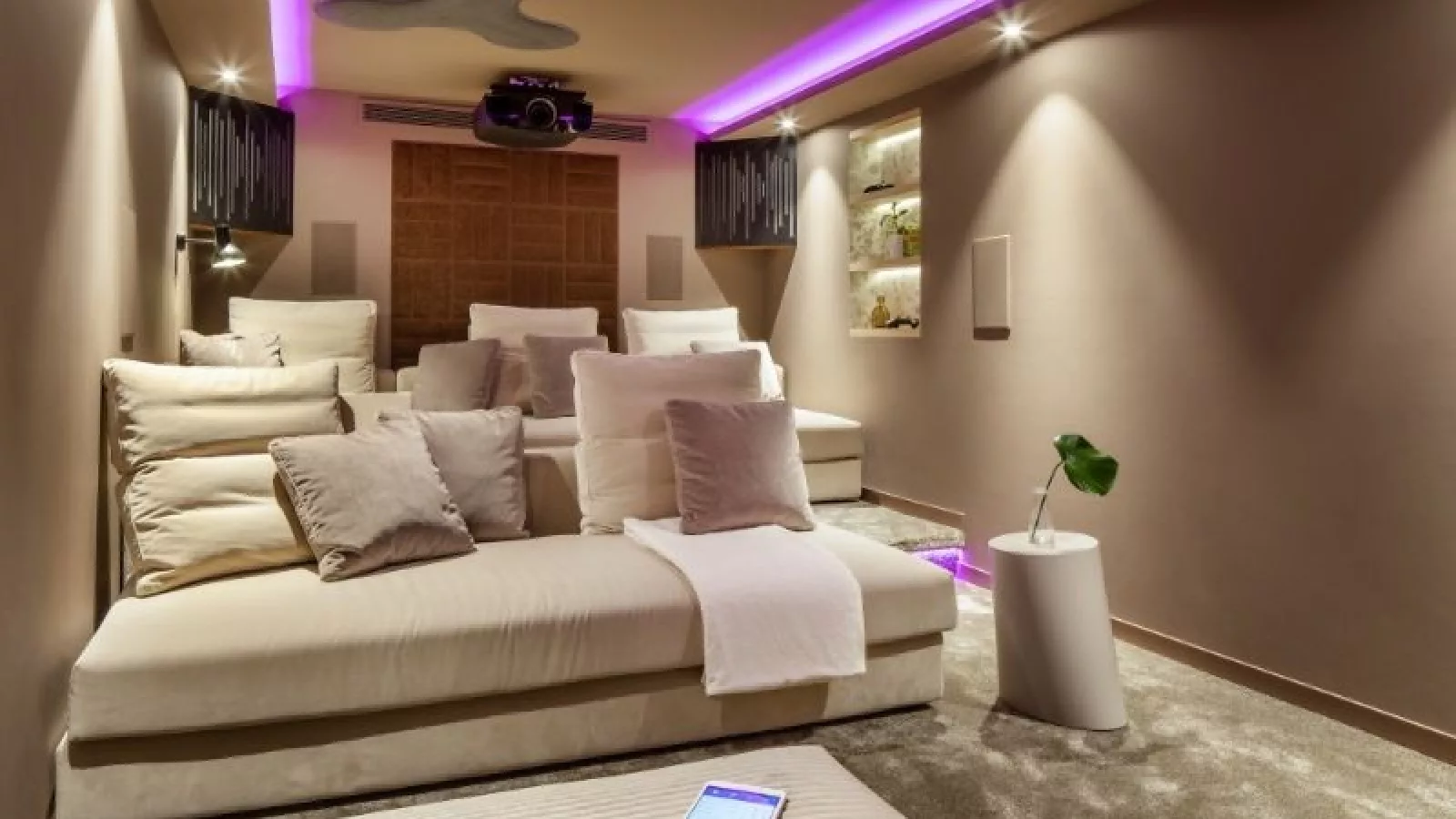 La pantalla de cine se esconde en unas cortinas motorizadas, tiene una mesa de mezclas para crear un ambiente de discoteca, y finalmente toda la decoración recuerda a lo que pretendía el cliente.