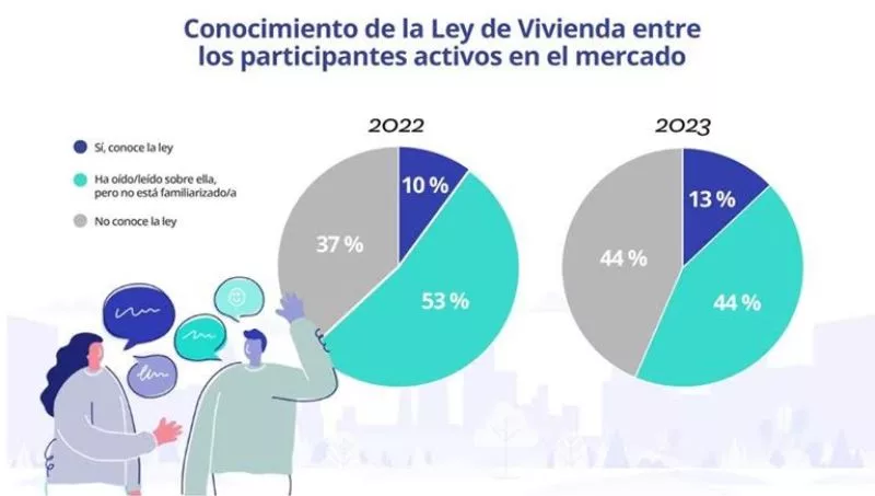 Por otro lado, el nivel de desconocimiento completo de inquilinos es mayor que en arrendadores: 49% frente a 38%, aunque más de la mitad de ambos grupos conoce la ley, o ha oído al menos hablar de ella: en el caso de los arrendadores, este porcentaje es del 62%, mientras que en el de los inquilinos alcanza el 51%.