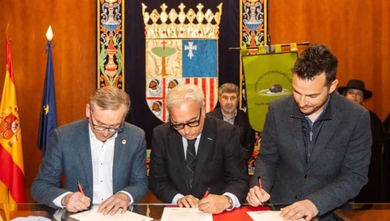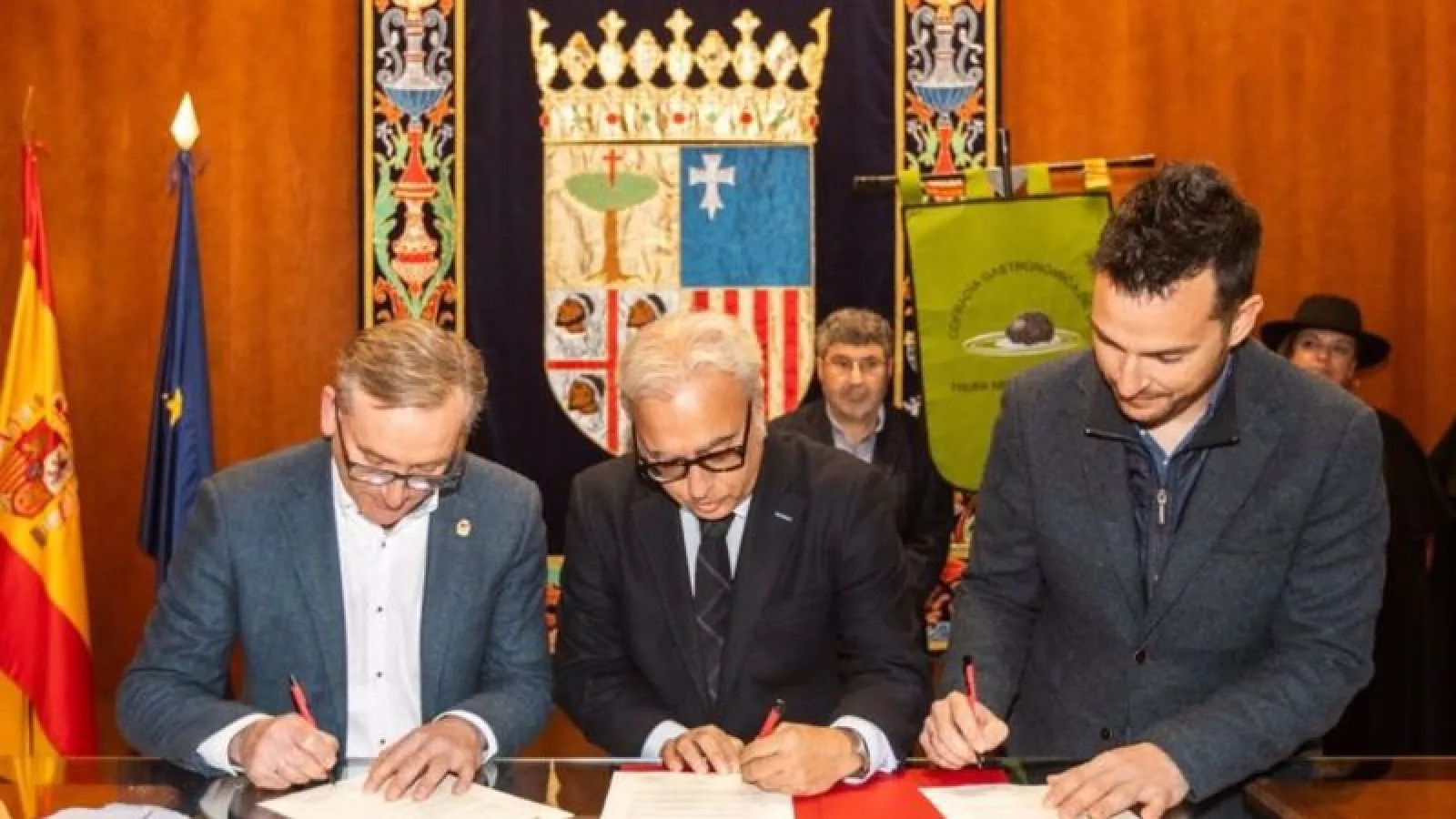 Durante el acto, el consejero de Agricultura, Ganadería y Alimentación ha suscrito un protocolo de colaboración con el presidente de la Diputación Provincial de Teruel, Joaquín Juste, y el presidente de la Asociación de Trificultores y Recolectores de Trufa de Teruel (Atruter), Daniel Brito, para la promoción de la Trufa de Teruel.
