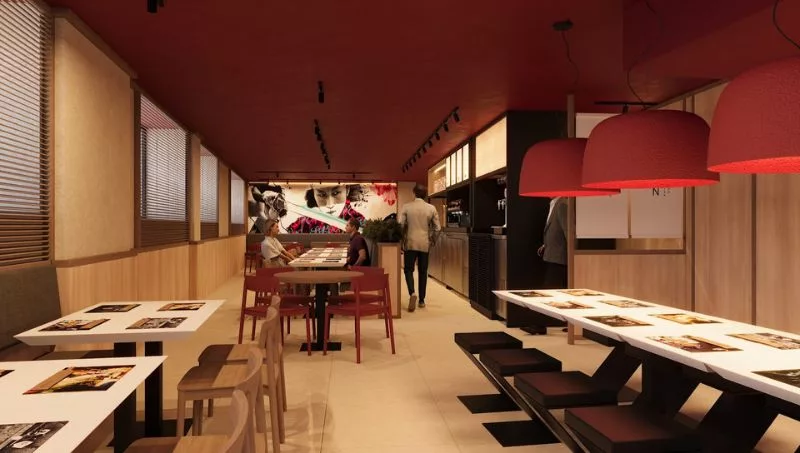 El nuevo restaurante de UDON en Granollers cuenta con una superficie total de más de 160 m², distribuida entre una planta principal y un amplio sótano que alberga dos zonas de almacén. El espacio está diseñado para acoger hasta 100 comensales en el interior y otros 16 en su terraza exterior, ofreciendo así una estancia cómoda y versátil tanto en la sala como al aire libre.
